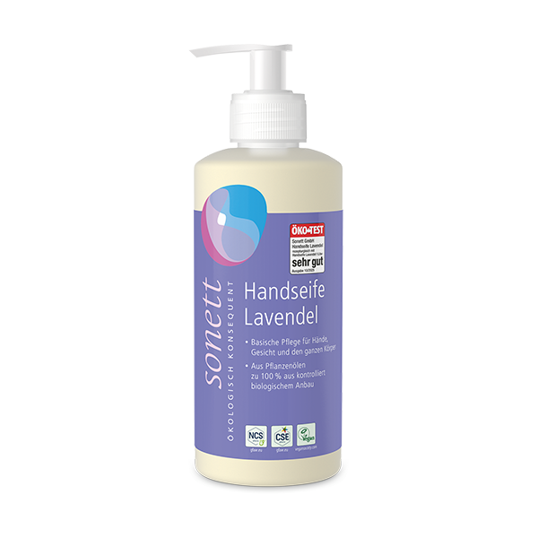 Milde und pflegende Seife mit dem klaren Duft des reinen Lavendels für Hände, Gesicht und den ganzen Körper — ausgezeichnet mit Ökotest »sehr gut«. Aus Bio-Pflanzenölen und ätherischen Ölen, die aus kontrolliert biologischem Anbau oder Wildsammlung stammen. 100 % biologisch abbaubar. Vegan. Erhältlich in den Größen 120 ml, 300 ml, 1 Liter und 10 Liter.